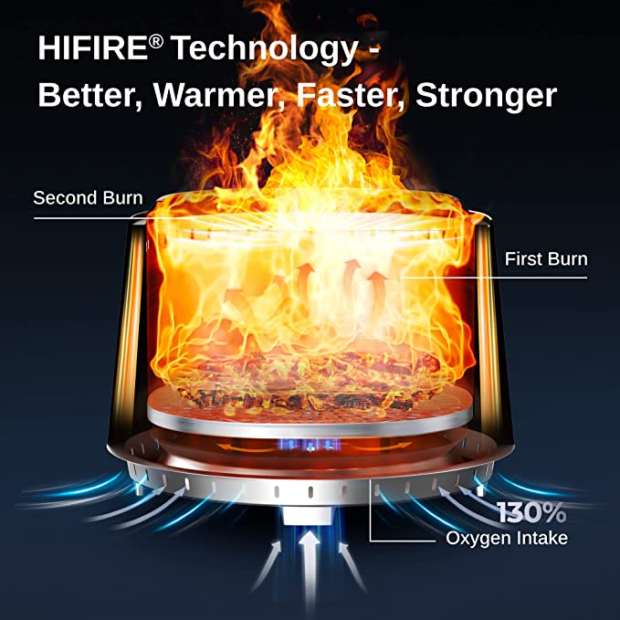 - 𝗦𝗺𝗼𝗸𝗲𝗹𝗲𝘀𝘀 𝗮𝗻𝗱 𝗙𝘂𝗹𝗹 𝗖𝗼𝗺𝗯𝘂𝘀𝘁𝗶𝗼𝗻 𝗗𝗲𝘀𝗶𝗴𝗻: HiFire technology feeds more oxygen into the burning process and accelerates secondary flame generation to burn off smoke particles before it gets to your clothes and hair. Completely get rid of the inconvenience of a smoky flame, and enjoy your time outside